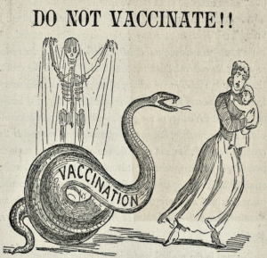 Ilustracja przedstawia plakat antyszczepionkowy z połowy XIX w.