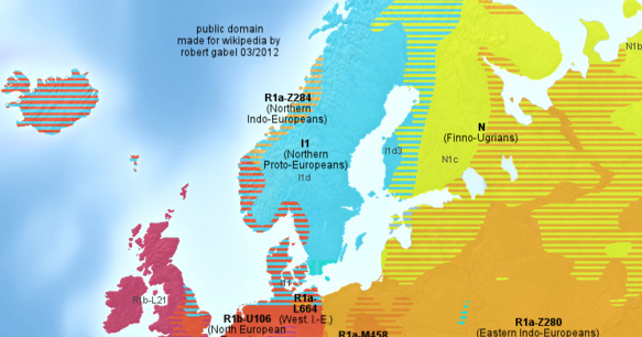 Wzdłuż Łaby pustynni ludożercy haplogrupy I udali się na północ docierając w okolice Magdeburga. Wykopaliska z okolic Magdeburga wykazały, że miejscowi Indo-Europejczycy (wówczas już z przewagą haplogrupy R1a) byli w stanie oprzeć się ludożercom, których niedobitkowie powędrowali dalej na północ, docierając w końcu ok. roku 5000 p.n.e. przez Danię (nazwa Danii związana ze szlachetnym rodem Duninów pojawiła się dopiero ok. 3000 lat później) na polodowcowe bagna i mokradła Skandynawii w okolice Motali skąd jako brutalni jaskiniowcy regularnie napadali rdzennych Skandynawów haplogrupy R1a zamieszkujących tam od wycofania się lodowca t.j. już od ok. 5000 lat, t.j. od ok. 10 000 p.n.e. Ze zgermanizowanych bastardów spłodzonych wśród skandynawskich Indo-Europejczyków wywodzą się wczesnośredniowieczni Normanowie (znaczne pozostałości pierwotnej haplogrupy R1a). Do dziś w trudnodostępnych górzystych rejonach Norwegii zachowało się do 40% rdzennej indo-europejskiej ludności R1a, natomiast w nizinnej Danii i Drewlenii (Holstein), t.j. głównym rejonie przemarszu inwazyjnych hord Androfagów (ludów germańskich) do Europy (od ok. 300 p.n.e.) do dziś zachowało się niecałe 8% rdzennej ludności R1a i to pomimo częstych transportów słowiańskich niewolników przez ten rejon we wczesnym średniowieczu i pomimo bliskości do słowiańskich grodów Drewlian, Wieletów i Obodrytów, w Travie (Hamburg), Bukowcu (Lübeck), Stargardzie (Oldenburg) czy Strzale (Strelitz).