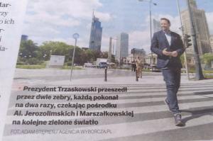W tej sytuacji „Gazeta Wyborcza” opublikowała okolicznościowe zdjęcie Rafała Trzaskowskiego na pasach – wykonane przez fotoreportera gazety w pozycji leżącej: po to, by udowodnić społeczeństwu, że Rafał nie jest karłem. Zdjęcie prezydenta, odpowiadającego żywotnym potrzebom warszawskiego społeczeństwa – gazeta żydowska opatrzyła sugestywnym podpisem, podkreślającym strategiczne znaczenie pasów na rondzie Dmowskiego: „Prezydent Trzaskowski przeszedł przez dwie zebry, każdą pokonał na dwa razy, czekając pośrodku Al. Jerozolimskich i Marszałkowskiej na kolejne zielone światło”.