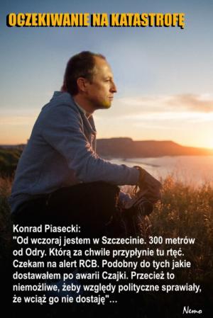 Z kolei red. Konrad Piasecki wybrał się do Szczecina by tam czekać na falę rtęci, której Niemcy nie znaleźli w rzece: "Od wczoraj jestem w Szczecinie. 300 metrów od Odry. Którą za chwile przypłynie tu rtęć. Czekam na alert RCB. Podobny do tych jakie dostawałem po awarii Czajki. Przecież to niemożliwe, żeby względy polityczne sprawiały, że wciąż go nie dostaję"…