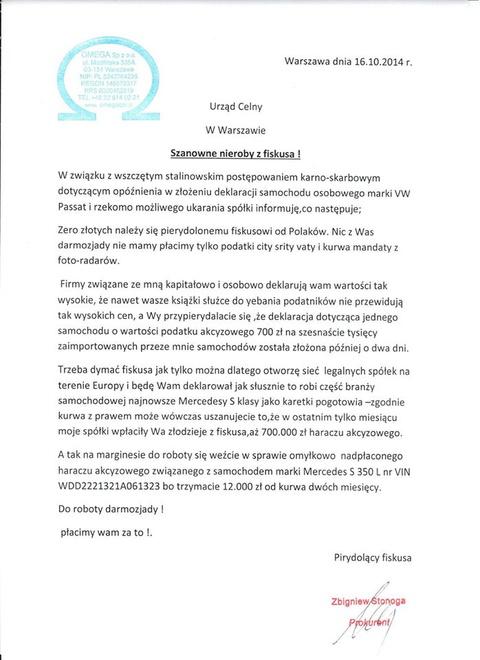 Zbigniew Stonoga znowu uderza: "Szanowne nieroby z fiskusa!" ZOBACZ PISMO
