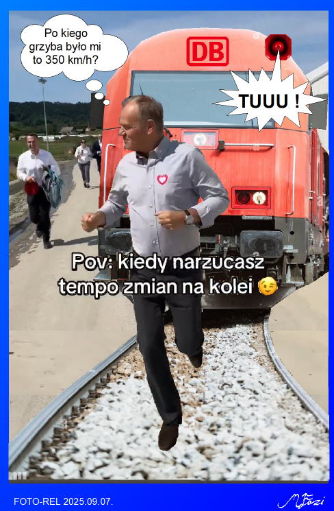 Donald Tusk zamieścił filmik, na którym biega sobie po placu budowy, a za nim galopuje jego świat w garniturach. Ponoć narzuca w ten sposób tempo zmian na kolei. Chodzi o tempo likwidacji PKP Cargo?