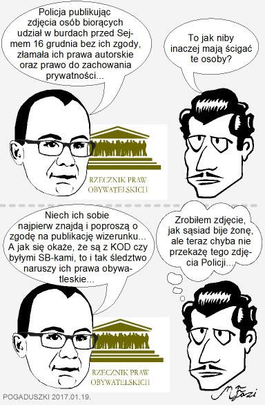 RPO Adam Bodnar wystąpił w roli obrońcy biednych demonstrantów, którzy odstawiali burdy pod Sejmem 16 grudnia 2016. Publikację ich zdjęć przez Policję w celu ich identyfikacji określił mianem ... łamania ich praw autorskich oraz łamania ich prawa do prywatności. Policja według niego, powinna najpierw uzyskać od nich upoważnienie do publikacji ich wizerunku! Czyli najpierw ich sobie złapcie, a potem publikujcie zdjęcia w celu ich złapania...