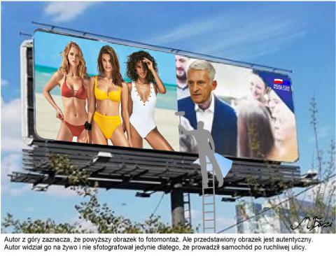 Poniższy obrazek jest fotomontażem. Ale jednocześnie jest prawdziwy. Kilka dni temu byłem świadkiem zalepiania billboardu z Jerzym Buzkiem reklamą kostiumów kąpielowych. Niestety, nie miałem jak zrobić zdjęcia powstałej zupełnie przypadkowo, ale kapitalnej scenie, jak Jerzy Buzek patrzy w biusty modelkom prezentującym kostiumy. Obrazek jest więc rekonstrukcją autentycznej, ulotnej chwili. I nie chodzi akurat o głównego bohatera billboardu. Chodzi o komiczny zbieg okoliczności, który mógł się przytrafić dowolnemu politykowi.