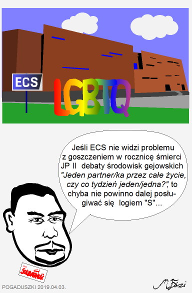 Piotr Duda, przewodniczący NSZZ Solidarność odniósł się do zorganizowania w gdańskim ECS gejowskiej konferencji na temat "Jeden partner/ka przez całe życie, czy co tydzień jeden/jedna?". Imprezę zorganizowano prowokacyjnie w rocznicę śmierci św. Jana Pawła II. Stwierdzając, że nie o takie wartości walczyli ludzie tworzący "S", a statut związku mówi o wartościach chrześcijańskich i nauce społecznej Kościoła, wyraził wątpliwości, czy ECS powinien posługiwać się symbolem "S"...