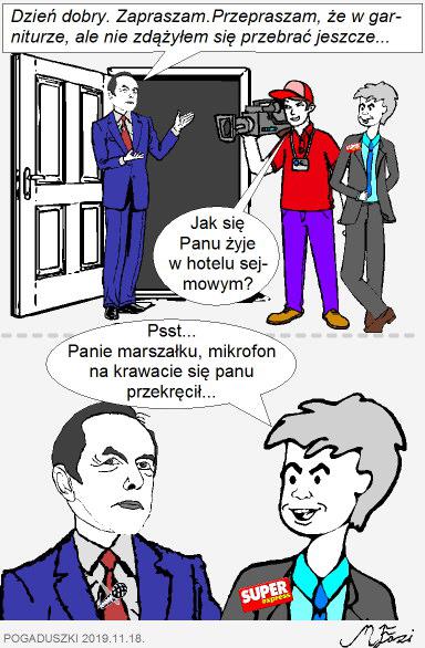Dziennikarza Super Express-u postanowili wpaść z wizytą i zobaczyć jak mieszka się marszałkowi Grodzkiemu w hotelu sejmowym. Marszałek powitał ich w progu pokoju i zapraszając do środka stwierdził, że nie zdążył jeszcze przebrać się z garnituru. Niby nic dziwnego... Tyle, że przy krawacie garnituru miał przypięty mikrofon. Jakby przebrał garnitur, to Super Express w swoim materiale video nie miałby dźwięku! Ciekawe, kiedy podkradli się do niego i przypięli mu potajemnie ten mikrofon? Co na to Straż Marszałkowska?