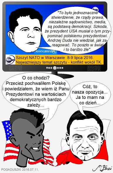 No, i poleciał. Pomijając to, że opierał się na swoich nadziejach na słowa Prezydenta Obamy, to nie zauważył, że słowa te nie musiały być skierowane do naszego Prezydenta. Mogły przecież spokojnie dotyczyć obecnej opozycji i tzw. "obrońców demokracji".