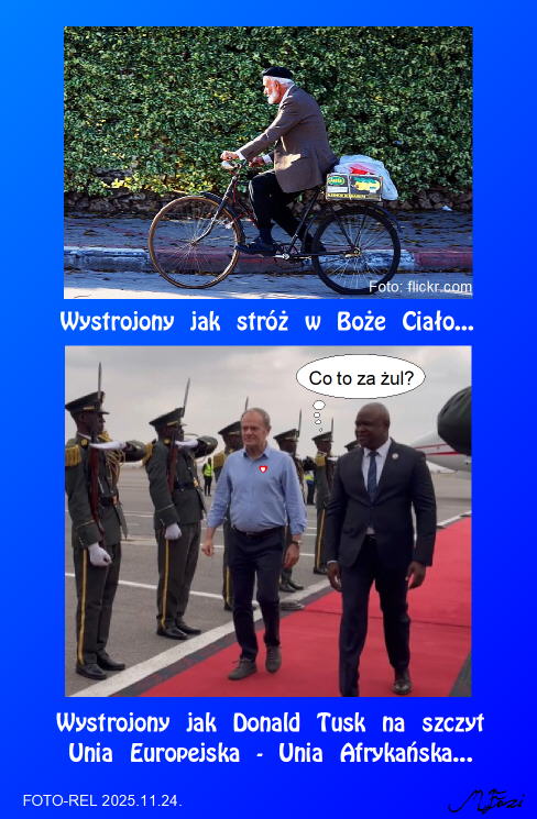 Pan premier Tusk wybrał się na szczyt Unia Europejskia - Unia Afrykańska. Zapewne przyjmując, że w Afryce teraz powinno być ciepło, pojechał w samej koszuli. Kompromitacja. Nawet tam poważni politycy na takie spotkanie ubierają Garnitur i zakładają krawat. Ale jak widać zwyczaje naszego Donalde pokazują, że jesteśmy 100 lat za Afro-afrykanami. A może pan premier po prostu uwalał sobie gartnitur podczas ostatniego grzybobrania i oddał go do prania, a w między czasie wyskoczył mu ten niespodziewany wyjazd? No, bo chyba nie uwierzył, że w Afryce nadal chodzi się w fartuszkach z liści palmowych...