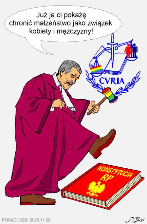 TSUE tylnymi drzwiami chce wprowadzić w Polsce sprzeczne z Konstytucją tzw. małżeństwa jednopłciowe". Polityczni sędziowiejawnie okazują pogardę dla Polski i jej praw. Dla naszej Konstytucji. Nic dodać, nic ująć...