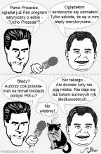 Trzeba mieć poczucie humoru. I Jarosław Kaczyński je ma. Nawet, jeśli z niego żartują. Pytany o parodiujący go serial internetowy "Ucho Prezesa" powiedział: "Dwa odcinki widziałem. Dobrze, że się śmieją, bo trzeba się śmiać. A że się śmieją ze mnie… No cóż, sam się – można powiedzieć – wepchnąłem". Stwierdził, że nieźle się uśmiał. Miał jedynie pretensje do autorów o merytoryczne nieścisłości dotyczące kotów. Dorosłym kotom nie daje się mleka, a satyrycy ponoć pokazali, że Prezes swojemu kotu je serwuje. Ciekawe, jak w podobnej sytuacji zachował by się Tusk. Bo Komorowski o ile wiem, posłał...