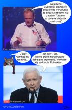 Tusk jak to już ma w zwyczaju, z pełną miłością i troską podszedł do prezesa PiS-u, Jarosława Kaczyńskiego. Kiedy dowiedział się, że ten ostatni uczestniczy w pikniku z wyborcami w Pułtusku, stwierdził: "Na pewno wygodniej prezesowi debatować w Pułtusku ze sobą i z dziećmi, niż z całym Tuskiem w otwartej debacie publicznej". Później, jako wybitny specjalista od haratania w gałę postanowił pouczyć Prezesa, jak wygląda piłka i ostrzegał przed dotykaniem grilla. Ot, kultura wypowiedzi.